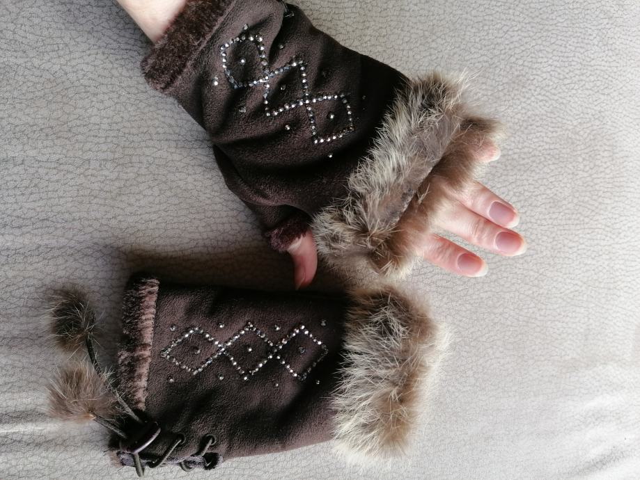 Zaradi neuporabe prodam elegantne rjave rokavičke z umetnim krznom, draguljčki in cofki.