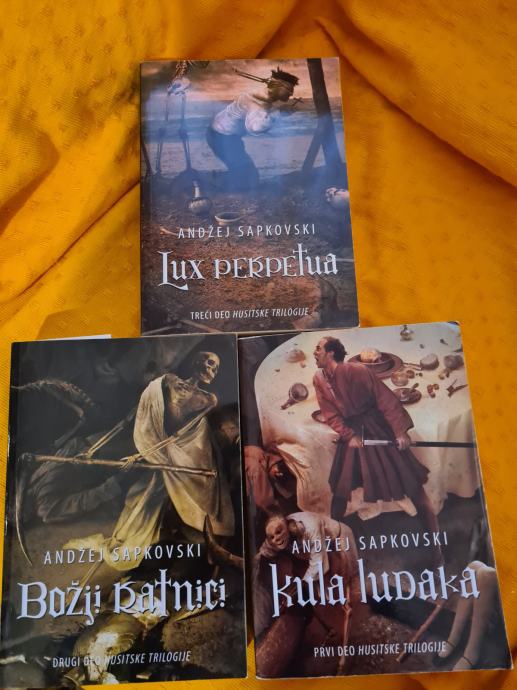 Prodam takoimenovano Husitsko trilogijo poljskega pisatelja Andrzeja Sapkowskega, popularnega avtorja sage o Veščcu (Witcher), katero tvorijo trije romani: Stolp norcev, Božji bojevniki in Lux Perpetua. Za razliko od sage o Veščcu tukaj ne gre za čisto fantasy literaturo ampak za zgodovinske romane v katere je vpleten element magičnega in pravljičnega. Junak je mladi Šlezijec Rajnmar iz Bjelave, študent medicine in magičnih ved katerega ljubezenska strast popelje v nepričakovano epsko avanturo, ki se razvije po deželah centralne in vzhodne Evrope med krvavimi Husitskimi vojnami. Pisateljev navdih prepoznamo v Henryku Sienkiewiczu, v zgodovinskih romanih Umberta Eca, v pikareskni literaturi in še kje. Knjige so v srbskem jeziku, v latinici. Podobno kot pri Vešcu prevodi v slovanskih jezikih mnogo bolje pričarajo šarm originala kot npr. angleščina.