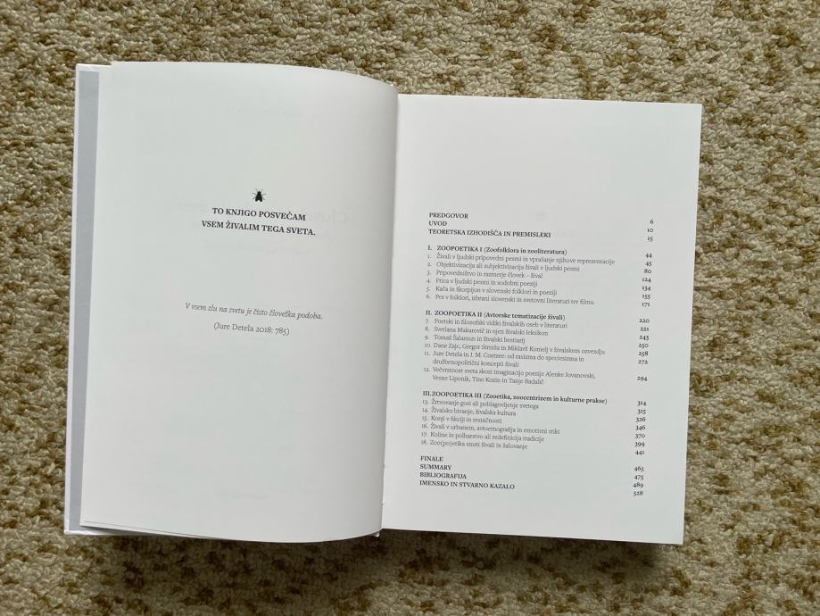 Knjiga je razdeljena na tri tematske sklope in 18 poglavij. Avtorica razpravlja o živalih v ljudski pesmi, pripovedništvu, poeziji, predstavlja psa v folklori, literaturi in filmu, ugotavlja različne negativne in pozitivne reprezentacije živali v medvrstnih odnosih in obravnava avtorske pesniške tematizacije živali.