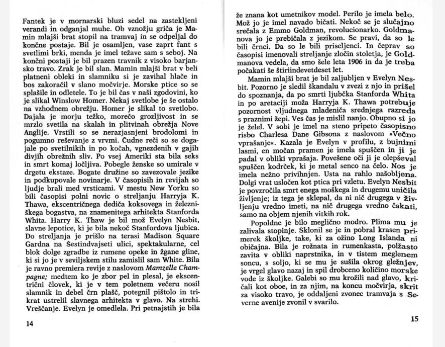 Ragtime, delo ameriškega pisatelja E. L. Doctorowa, sodi med najbolj vznemirljive literarne novosti zadnjih let, zato nas ne sme presenetiti, da je snov zamikala režiserja Miloša Forma-na (pred leti je tako uspešno poletel nad kukavičjim gnezdom), ki pripravlja film po tem nevsakdanjem besedilu. Namenoma ne uporabljamo izraza »roman«, zakaj Doctorow si ne prizadeva, da bi pripovedoval na ustaljen romanopisni način, temveč povezuje drobce, ki imajo na prvi pogled le malo skupnega, v izvrsten mozaik, nenavadno bogato kroniko življenja v Ameriki v letih pred prvo svetovno vojno, ko je Henry Ford uvedel tekoči trak, ljudje pa so noreli ob čarovnijah Harryja Houdini ja. V knjigi nastopa še vrsta osebnosti tedanjega časa: trije ameriški predsedniki, slavni arhitekt Stanford White, fi¬nančnik in zbiralec umetnin Picrpont Morgan, črnski prosvetitelj Booker Washington, anarhistka Emma Goldman, prva boginja seksa v ameriški zgodovini Evelyn Nesbit, Sigmund Freud, ki je v tistih letih brez večjega odmeva predaval v Ameriki in mnogi drugi.