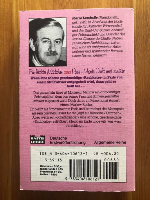 Prodam odlično ohranjen roman v nemškem jeziku z naslovom Ein leichtes Mädchen oder Paris - Monte Carlo und zurück (Lahko dekle - Paris - Monte Carlo in nazaj), pisatelja Pierra Lamballea. Knjigo je izdala založba Bastei Lübbe v Nemčiji, leta 1985, je v mehki vezavi in ima 288 strani.