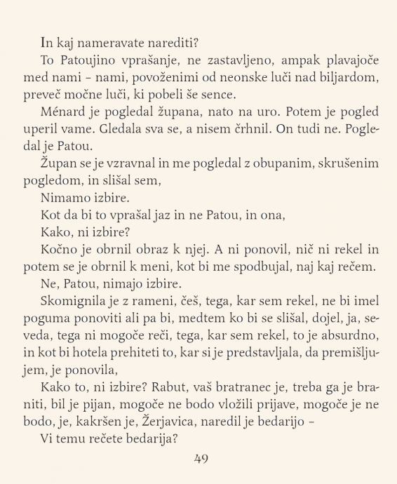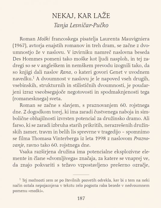 In v to rano, osebno in družbeno, dregne Mauvigner s svojim romanom. V rano, ki, kot v uvodnem citatu pove Genet, lahko postane človekova »notranjost«, ki jo bo »nato napihoval, jo polnil«. Zdi se, da enako lahko velja tudi za družbo, ki rane ne celi, ampak jo napihuje in se z njo povsem poistoveti.