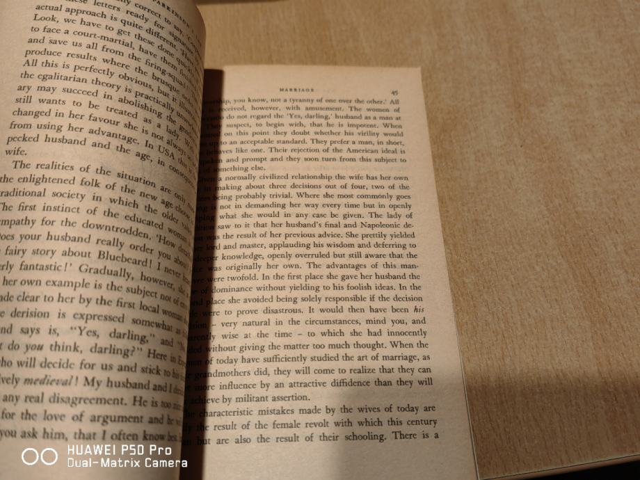 G. Parkinson, ki je imel v svojem Newtonovem zakonu tako zelo prav, zdaj, tako kot še en privlačen videc, domači igralec Robert Morley, spoštuje imperativ, da Tory-it gor in dol o mimoidočem prizoru. V tem seveda ni nič narobe, vendar tega ne gre jemati kot evangelij. Tokrat gre za poroko. Predvidljivo se oko vrne k srečnemu redu preteklih let. Dekleta bi morala vedeti, da je spolna enakost neuporabna - odkrita podrejenost vodi do ""običajno odločilnega vpliva"": Deweyjevo izobraževanje je neumnost; oh, za grmenje očetove jovianske noge na stopnicah! Toda potem je med godrnjavci in hudomušnicami gdč. Parkinsonov zakon: ""Delo pod pritiskom proizvaja toploto, ki se razširi, da napolni razpoložljivi um, iz katerega bo prešla le v um, ki je relativno hladnejši."" Sledi zelo obremenjena podporna enačba. Na žalost sploh ni nobenega za prijetno ugotovitev, da je nesmiselno ponavljanje ustvariti potomce samo zaradi zamenjave starša. (Zakaj bi moral računovodja "preživeti svoje življenje, da skupnosti zagotovi drugega borznega posrednika" in obratno?). Med nasveti o poročenih potovanjih, zabavi, vzgoji otrok (dajte jim cilj in zahtevajte, da se pridružijo), avtomatizaciji in romantiki - nekaj citiranih kanonov. Zunaj zakona nekaj potegavščin; nekaj zehanja.