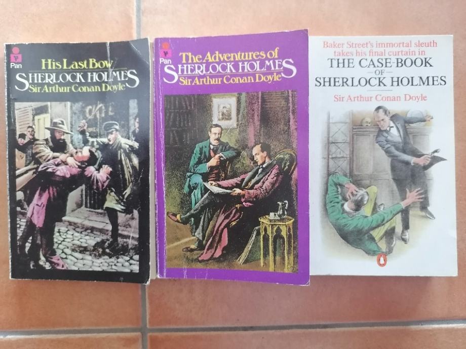 Knjige SHERLOCK HOLMES, 3 knjige v angleškem jeziku, naslovi vidni iz slike, žepnice, broširane, solidno ohranjene, v kompletu 3 knjige za 10 eur.