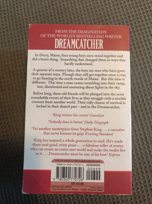 Prodam roman Stephena Kinga z naslovom Dreamcatcher. Knjiga je lepo ohranjena. Čeprav je v oglasu označena možnost "Brez skrbi", knjigo prodam izključno tako, da jo prevzamete sami.