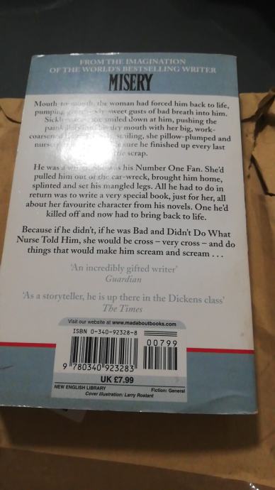 Prodam roman Stephena Kinga z naslovom Misery. Knjiga je lepo ohranjena. Čeprav je v oglasu označena možnost "Brez skrbi", knjigo prodam izključno tako, da jo prevzamete sami.
