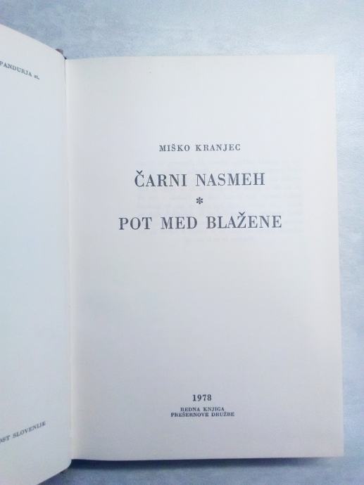 Knjiga Čarni nasmeh, pisatelja Miška Kranjca , izdana leta 1978 pri Prešernovi družbi, v knjig sta dve povesti Čarni nasmeh in Pot med blažene, natisnjena je na 300 straneh, knjiga je lepo ohranjena.