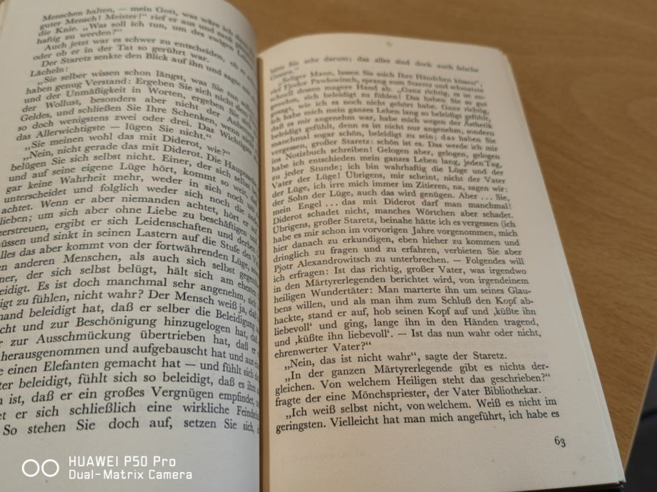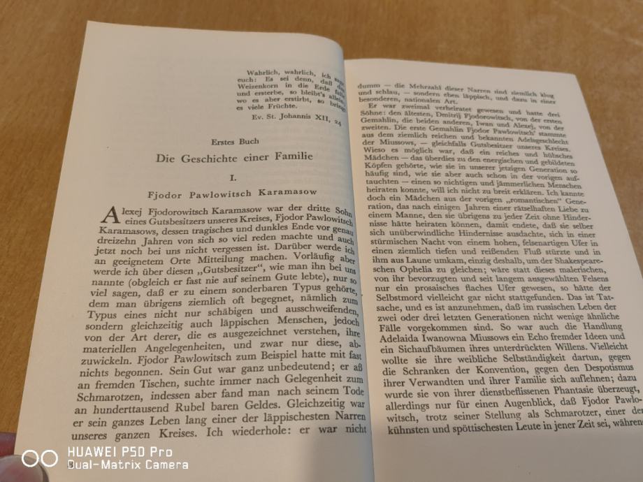 Inhalt: Es scheint beinahe unmöglich, die auf verschiedenen Ebenen sich entfaltende Handlung bündig zu referieren, zu Grunde liegt aber auch diesem Roman die bei Dostojewski typische Fabel einer Kriminalerzählung: Die drei Söhne von Fjodor Karamasow, einem alten Lüstling und Possenreißer, kehren als Erwachsene ins Elternhaus zurück und müssen sich mit ihrem Hass auf den Vater auseinander setzen, dessen Tod sie alle mehr oder minder offen wünschen[...] N. S.