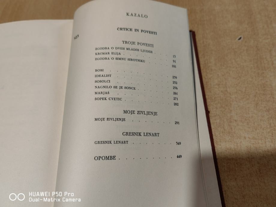 Vsebina Vsebina: Knj. 1: Pesmi ; Erotika ; Črtice in povesti ; Vinjete. - 1951. - 571 str. ; Knj. 2: Knjiga za lahkomiselne ljudi ; Ob zori ; Tujci. - 1951. - 485 str. ; Knj. 3: Na klancu ; Hiša Marije Pomočnice ; Mimo življenja. - 1952. - 583 str. ; Knj. 4: Križ na gori ; Polikarp ; Gospa Judit ; Potepuh Marko in Kralj Matjaž. - 1952. - 513 str. ; Knj. 5: Martin Kačur ; Poslednji dnevi Štefana Poljanca ; Spomladi ; Smrt in pogreb Jakoba Nesreče ; Aleš iz Razora ; Hlapec Jernej in njegova pravica. - 1952. - 573 str. ; Knj. 6: Za križem ; Sosed Luka ; Kurent. - 1953. - 413 str. ; Knj. 7: Troje povesti ; Moje življenje ; Grešnik Lenart. 1954. - 523 str. ; Knj. 8: Moja njiva ; Podobe iz sanj. - 1955. - str. 503. ; Knj. 9: Jakob Ruda ; Za narodov blagor ; Kralj na Betajnovi ; Pohujšanje v dolini šentflorjanski ; Hlapci ; Lepa Vida. 1957. - 575 str. ; Knj. 10: Kritični in polemični spisi ; Krpanova kobila ; Bela krizantema. - 1959. - 605 str.