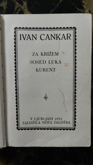 Nov založba, Ljubljana , l.1932, tri povesti: Za križem, Sosed Luka, Kurent, za ostalo tel. 040 227 377