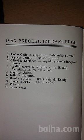 Vsebuje tudi Zv. 1: Štefan Golja in njegovi ; Tolminske novele [Matkova Tina ; Sin pogubljenja ; Rutharius christianus ; Glejte, človek ; Pulver und Blei ; Pustna pridiga ; Runje ; Tolminski Tit Manlij Torkvat ; Gospoda Matije zadnji gost]. - 1928. - 253 str.; Zv. 2: Bogovec Jernej ; Balade v prozi. - 1928. - 255 str.; Zv. 3: Odisej iz Komende ; Zapiski gospoda lanspreškega. - 1929. - 269 str.; Zv. 4: Zgodbe zdravnika Muznika : (I. in II. del) ; Tolminske matere sveta noč. - 1929. - 255 str.; Zv. 5: Magister Anton. - 1930. - 271 str.; Zv. 6: Idile in groteske. - 1931. - 224 str.; Zv. 7: Ženske povesti ; Od Kranja do Brezij. - 1932. - 226 str.; Zv. 8: Simon iz Praš ; Usehli vrelci. - 1933. - 218 str.; Zv. 9: Tolminci. - 1934. - 383 str.; Zv. 10: Otroci sonca. - 1935. - 335 str.