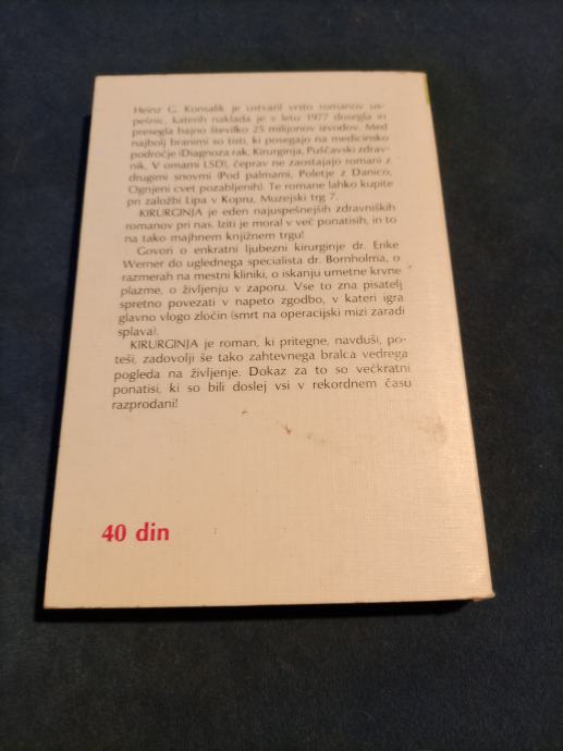 Kirurginja,avtor Heinz G.Konsalik, založba Lipa 1977 letnik,knjiga ima 257 strani, pošljem po pošti ali osebni prevzem.knjiga je v zaboju pod zaporedno številko 22.