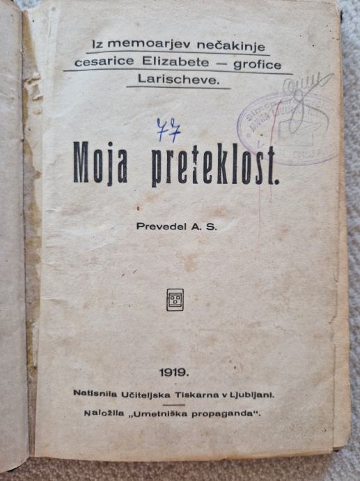 Prodam knjigo Moja preteklost - Iz memoarjev nečakinje cesarice Elizabete - grofice Larischeve, l. 1919, Natisnila Učiteljska Tiskarna v Ljubljani, naložila Umetniška Propaganda, trda vezava, 146 strani. Knjiga je lepo ohranjena.