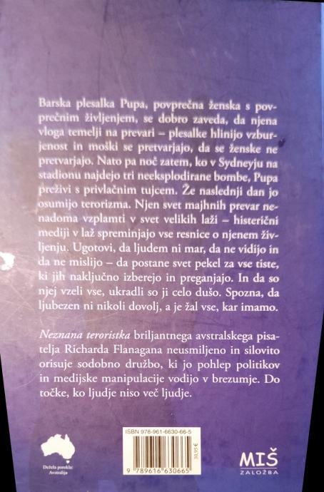 Neznana teroristka,avtor Richard Flanagan,miš založba 2008 letnik,knjiga ima 341 strani,lepo ohranjena,trdne platnice,pošljem po pošti ali osebni prevzem.knjiga.je v zaboju pod zaporedno številko 36.