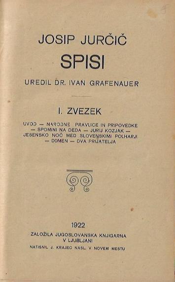 Vsebuje tudi Zv. 1: Uvod ; Narodne pravljice in pripovedke ; Spomini na deda ; Jurij Kozjak ; Jesensko noč med slovenskimi polharji ; Domen ; Dva prijatelja. - V Ljubljani : Jugoslovanska knjigarna, 1922. - 274 str.; Zv. 2: Jurij Kobila ; Tihotapec ; Vrban Smukova ženitev ; Kloštrski žolnir ; Grad Rojinje ; Golida. - V Ljubljani : Jugoslovanska knjigarna, 1923. - 286 str.;