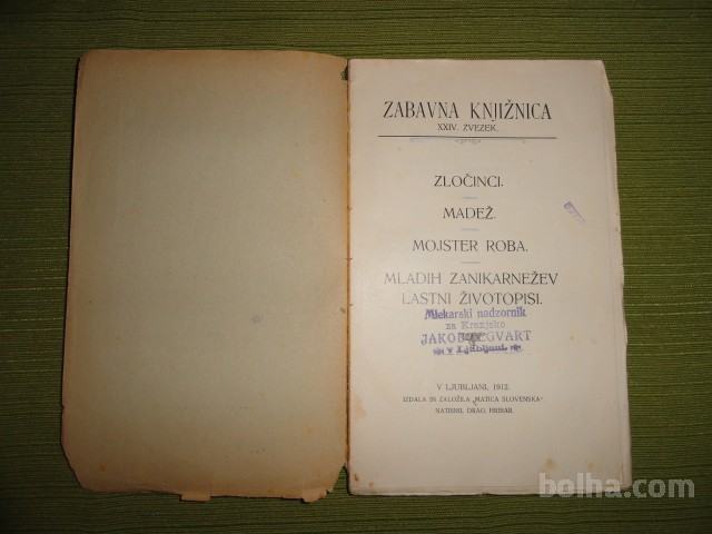 ZABAVNA KNJIŽNICA, izdala in založila MATICA SLOVENSKA, leto izdaje 1912. Srednje ohranjena. Ogled možen v Ljubljani(poleg Eleclerca). Informacije na telefon 041 683-891, Robert.