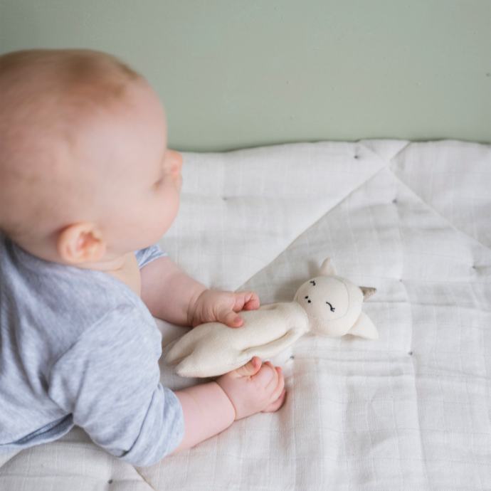 Ropotuljica samorog je izdelana iz 100% ekološkega bombaža s polnilom iz recikliranega pliestra. Ljubka ropotuljica je pravšnja in enostavna za prijem dojenčkovih malih rokic.