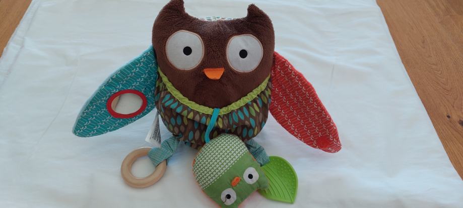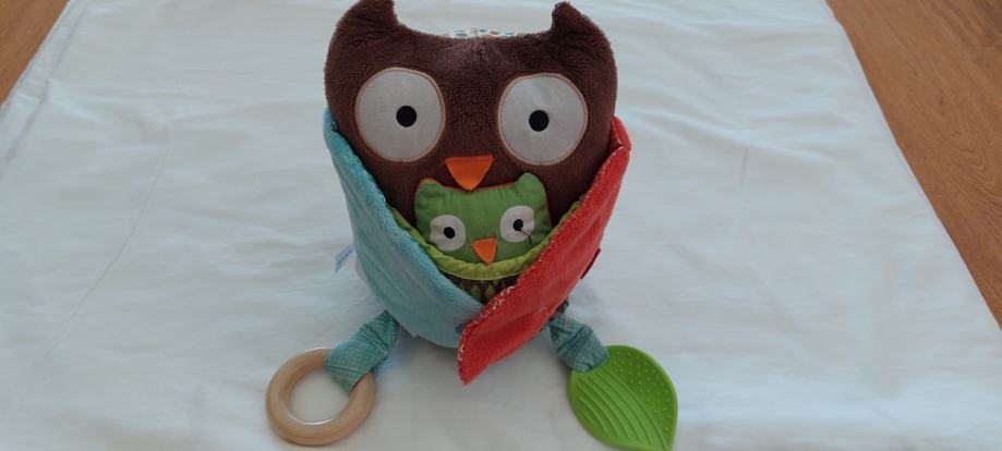 Sovica, ki v žepku nosi in s krilci objema sovico mladička, ki piska. Krilca šelestijo in imajo vgrajeno ogledalo. Lesen obroček in plastičen list za žvečenje. Ob premikanju pa nežno zvončklja. Ni znakov obrabe.