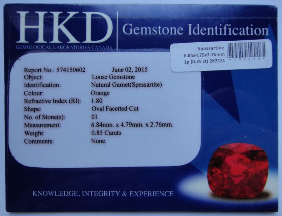 LaZooRo: Spesartin 0.85ct - Certifikat