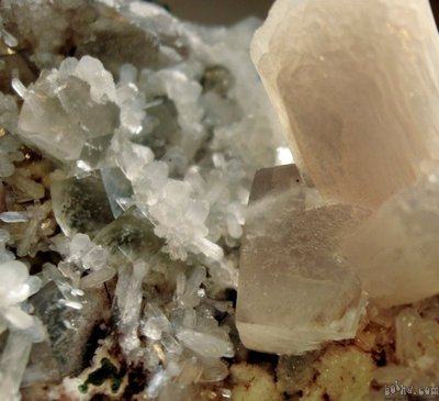 Kristali dezmina in kalcita iz Poone, Indija. Velikost primerka 15 x 11 cm - leto 1984.