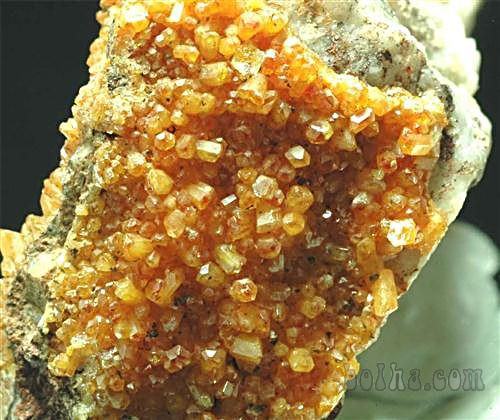 Množica podolgovatih kristalov vanadinita na podlagi. Kristali so lepe oranžne barve. Nahajališče J.C. Holmes Claim, Santa Cruz County, Arizona,ZDA.