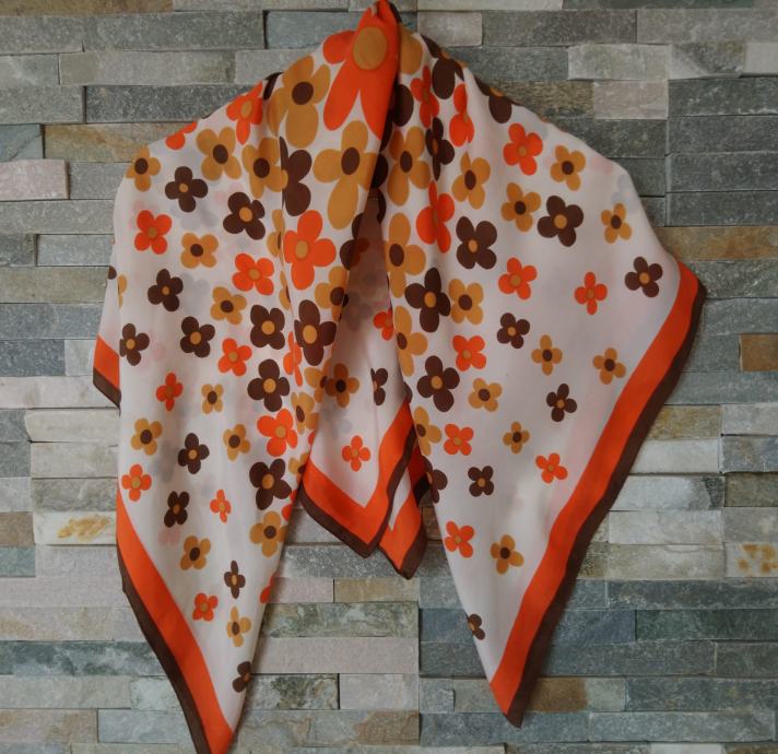 Svilena rutka v rjavo oranžni beli barvi s cvetličnim vzorcem. Velikost 85 cm x 89 cm. Lepo ohranjena.