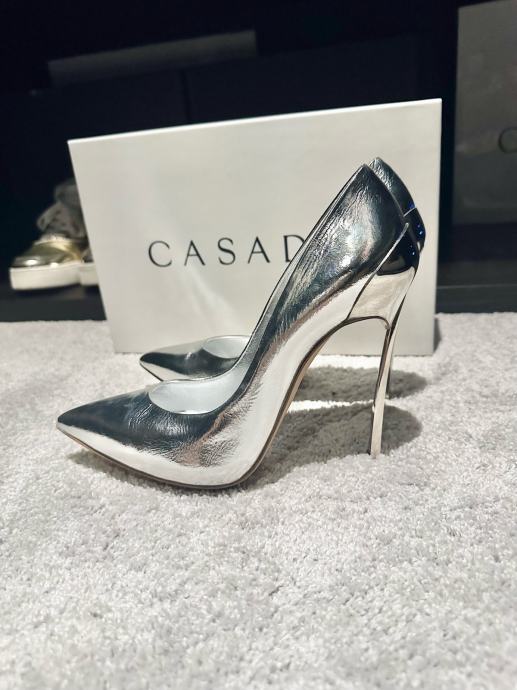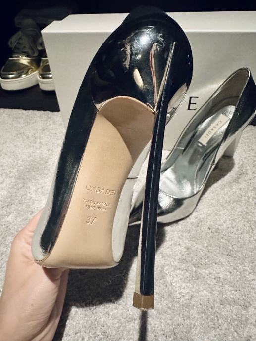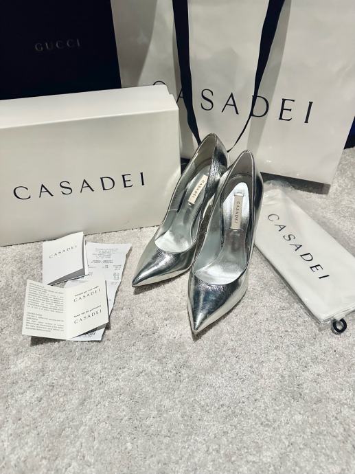 Prodam Casadei Metallic srebrne visoke Blade pete številka 37, ker so mi premajhne po nosečnosti. Čevlji so seveda usnjeni in v odličnem stanju, brez poškodb, saj so obuti le enkrat za fotografiranje. Priložim vse kot kupljeno, s certifikatom, zapakiranimi dust bagi, škatlo in tudi papirnato Casadei vrečko. Kupljeni so v Noventi di Piave po ceni, ki je vidna na računu kot edini razpoložljiv kos, cena novih čevljev je 650 eur.