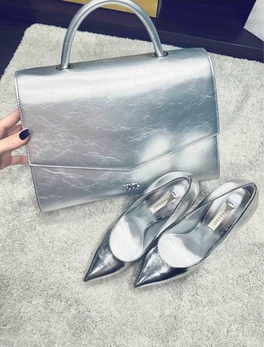 Casadei Blade Metallic Silver Leather Pumps + Karl Lagerfeld torbica