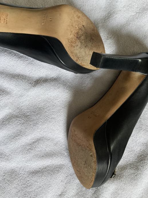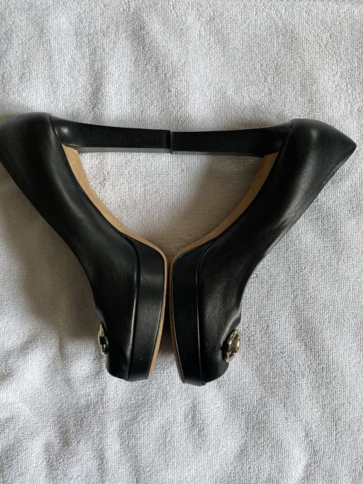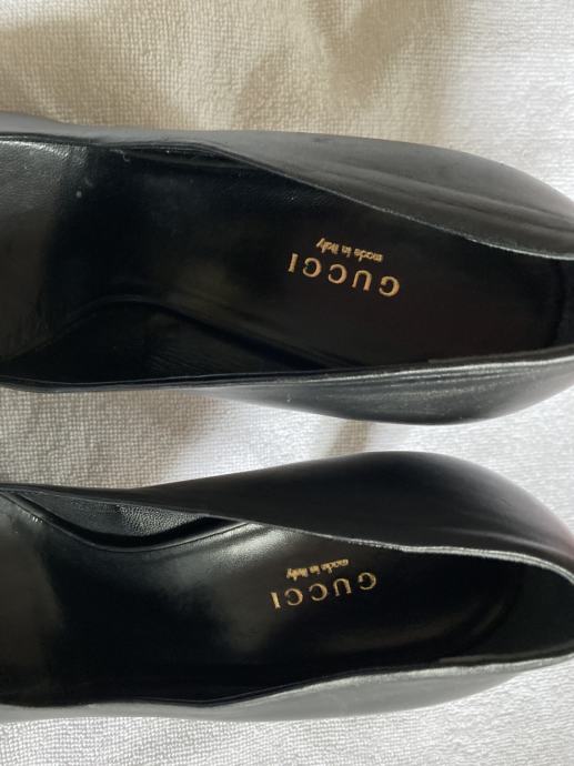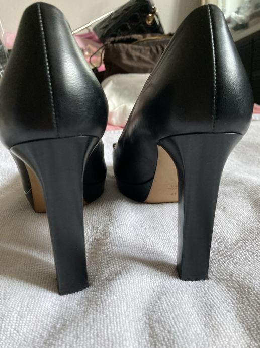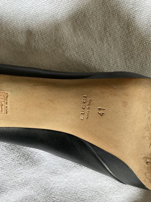 Gucci original salonarji peep toe, št 41, MPC 695€, črno usnje z značilnim logotipom horsebit, ki je sinonim za Gucci znamko, višina pete 12 cm, višina platoja spredaj 1,8 cm. Nošeni 2 x. Lepo pašejo na vse outfite. Plačani 695€, žal zaradi poškodbe gležnja petk ne morem več nositi. Priložim dust bag original Gucci.