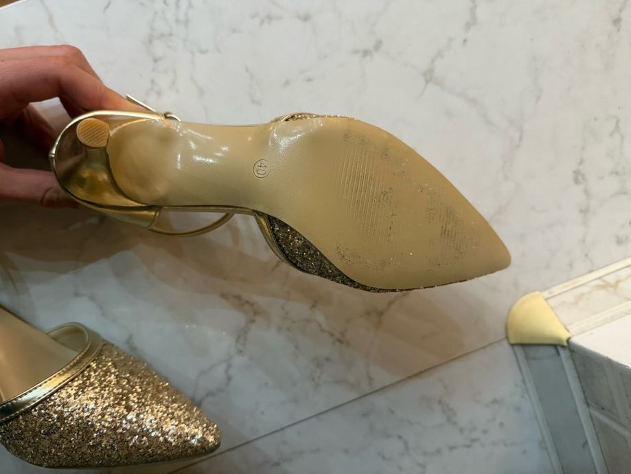 Številka 39,5 do 40. Povsem novi. Čisto nenošeni, saj so bili kupljeni preveliki. Spredaj imajo čudovite bleščice in se lepo svetijo. Primerni so za vse svečane prireditve, kot so sveta birma, maturantski ples, poroka, podelitve priznanj.