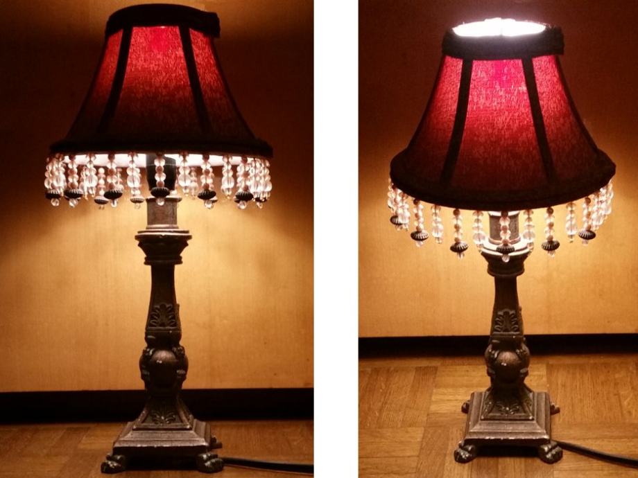 Senčnik se s svojima dvema žičnima lokoma natakne na svečno žarnico s tankim navojnim vratom (E14) - zdaj je vstavljena svečna varčna sijalka 6W (ekvivalent klasične žarnice na žarilno nitko 40W), po želji lahko dodam klasično svečno žarnico na žarilno nitko, 40W.