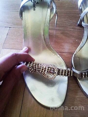 Bata zlate svetleče sandale sem imela obute za maturantski ples. Barva je nevpadljiva, primerna za kombinacijo s praktično katro koli obleko. Spodnji del krasi zaponka iz svetlečih se kristalčkov. Pašček se okoli noge ovije enkrat. Višina pete (merjeno na skrajnem koncu čevlja od tal do podplata) je 10 cm. Čevelj je stabilen in eleganten. Zlata barva na podplatu se je na sprednji strani nekoliko odluščila, vendar to ni vidno, ko imate čevlje obute.