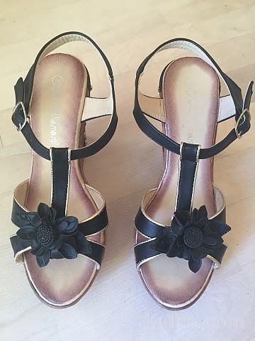 Sandali so zelo lepo ohranjeni, obuti le dvakrat. Črne barve z zlato obrobo.