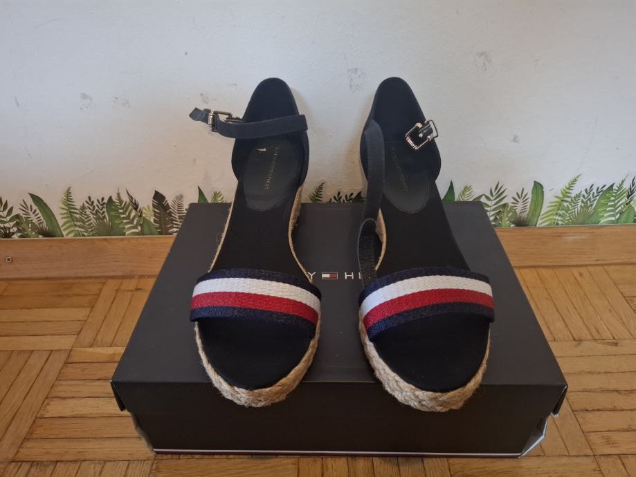 Ugodno prodam 1x obute original sandale tommy hilfinger, peta 7cm, številka 41. Obute 1x, zame previsoka peta