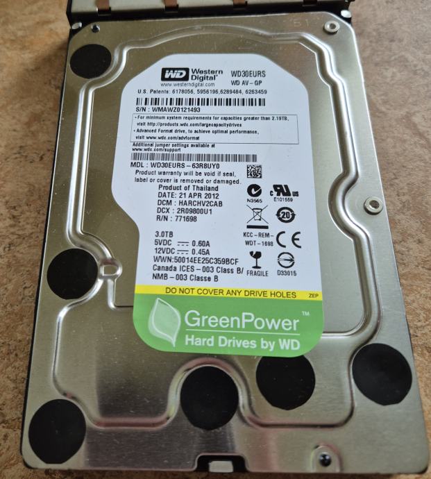Prodam trdi disk Western Digital WD30EURS Green 3TB, HDD, SATA2, 3.5 palični. Brezhiben. Na voljo so štirje diski.
