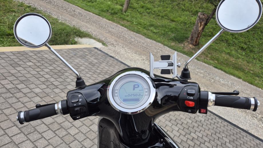 Hitrost do 75 Km/h, doseg do 80 km (odvisno od načina vožnje), zamenljiva Li-ion baterija 2,88 KWh. Polnjenje je možno s priloženim polnilcem na običajni vtičnici.