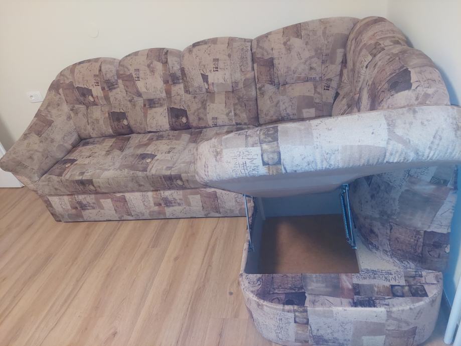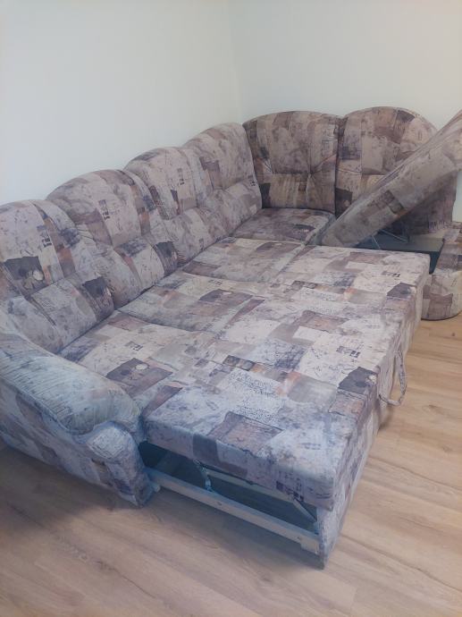 Sedežna garnitura ima izvlečno posteljo in dodatni predal za shranjevanje posteljnine