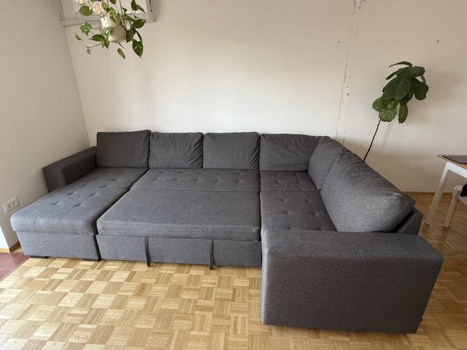 Prodajam sivo sedežno garnituro, kot nova. Možnost podaljšanja sredinskega dela (glej slike) in prostor za shranjevanje.