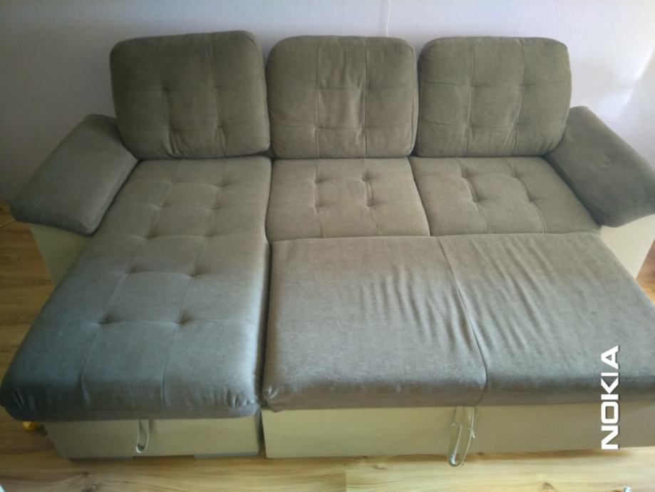 Sedežna, slabi 2 leti rabljena- velikost 245x135, sive barve, s predalom, raztegne se lahko v ležišče, kot je razvidno iz slike. Za ceno možen dogovor.
