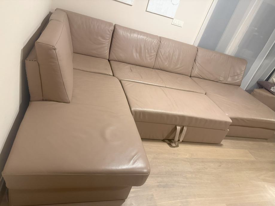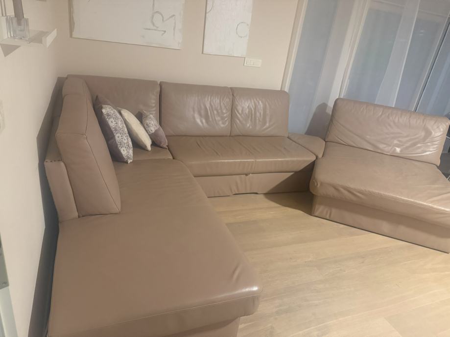 usnjeno sedežno (debelo usnje), rjave barve, s posameznimi enotami, ki se sestavijo ali postavijo ločeno, z izvlečnim ležiščem in počivalnikom, staro 7 let, maksimalnim mer 245 x 390 cm, izdelana po meri, prodamo, cena: 170€, Šmarje Sap, tel: 031-819-772