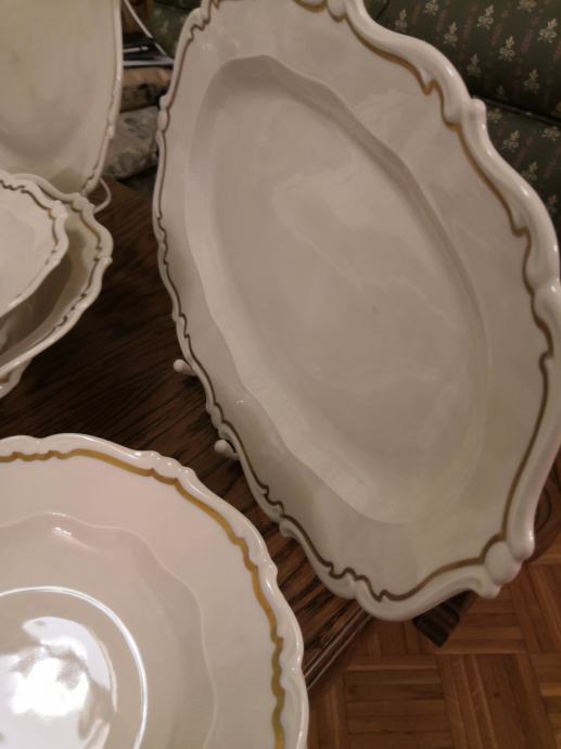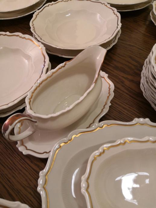 Antik - Art Déco , jedilni servis (komplet) za 12 oseb, (CREM BARVE - slonova kost), znamke SORAU CARSTENS PORCELAN - ročna poslikava, datira med leti od 1918 do 1939 (zbirka iz vitrine - po pokojni stari mami). Servis je v odličnem stanju, brez poškodb in odrgnin, saj je bil vsa ta leta v vitrini, in se ni uporabljal, zato je še tudi v celem kompletu.