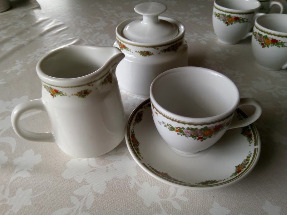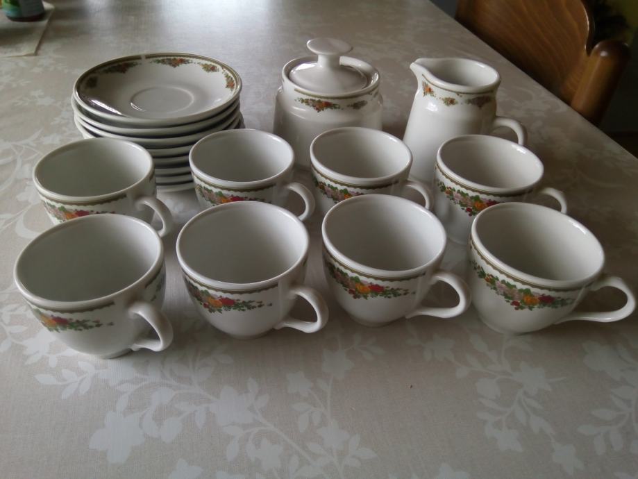 Prodam porcelan retro kavni servis za 8 oseb, ki vsebuje: 8 skodelic, 8 krožničkov, 1 vrček za mleko in 1 sladkornica - kupljen v Nemčiji, vse brezhibno ohranjeno, nerabljeno.