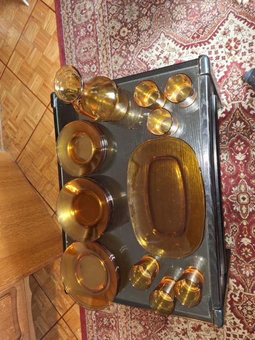 Stekleni servis za 6 oseb z vrčem in kozarci. Praktično zelo malo rabljen.