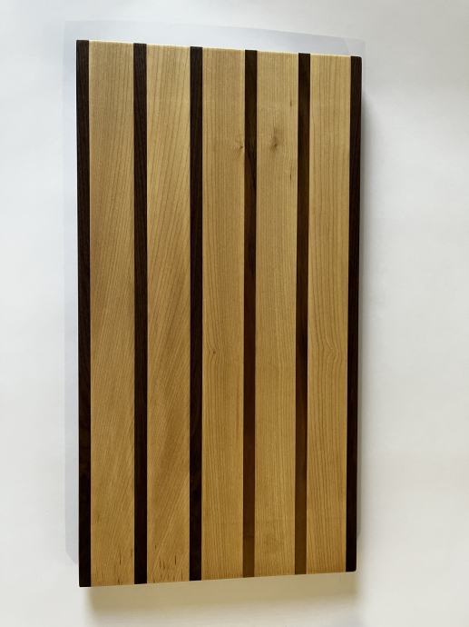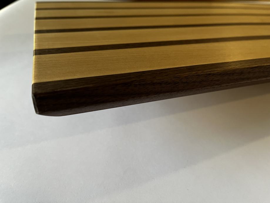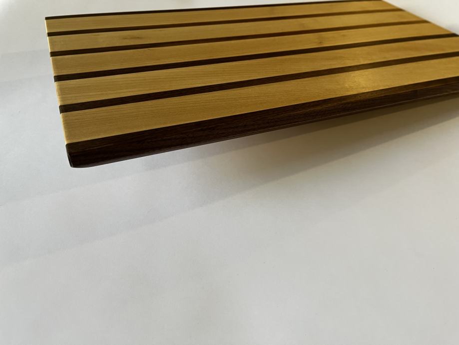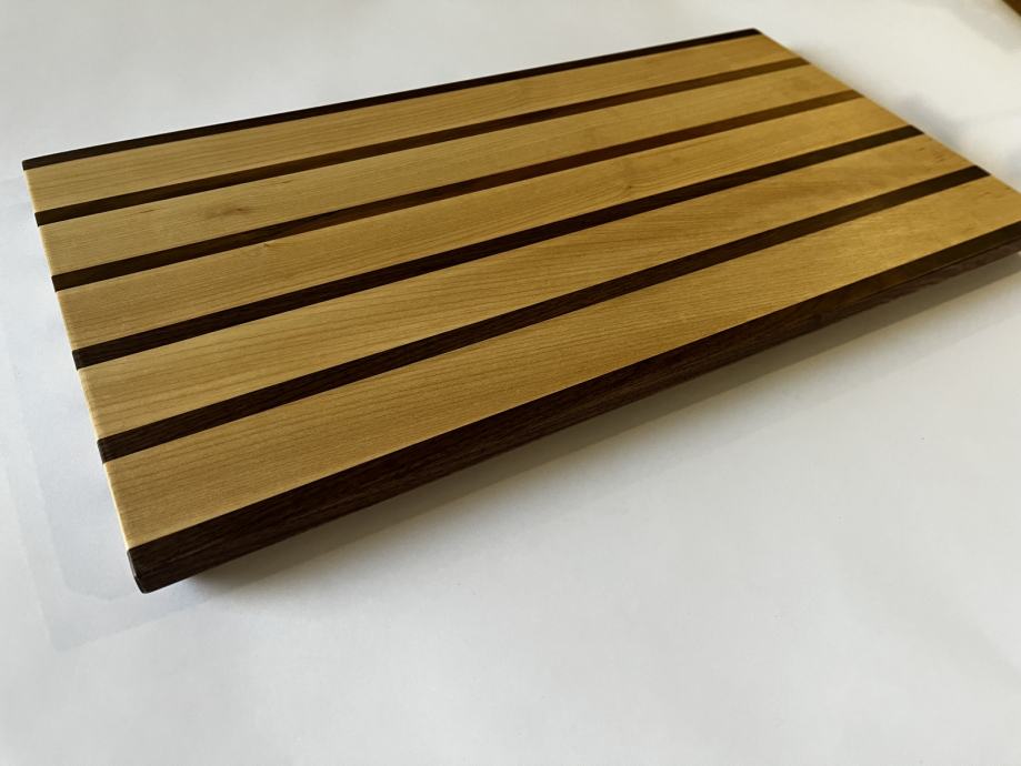 Nova servirna deska v kombinaciji oreha in javorja dimenzije 52,5x28cm in debeline 2,5cm. Deska je oljena z oljem neškodljivim za ljudi.