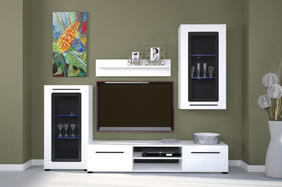 Uresničite svoje ideje in sanje o stanovanju s tem čudovitim dnevnim regalom. Poleg najmodernejšega videza vas bo prepričala uporabnost omaric. Ta dnevna soba bo zagotovo pritegnila marsikateri pogled. Obogatite svojo dnevno sobo z modernim vzdušjem. Poskrbite za novo podobo vaše dnevne sobe. LED osvetlitev se nahaja v omari s steklenimi vrati.