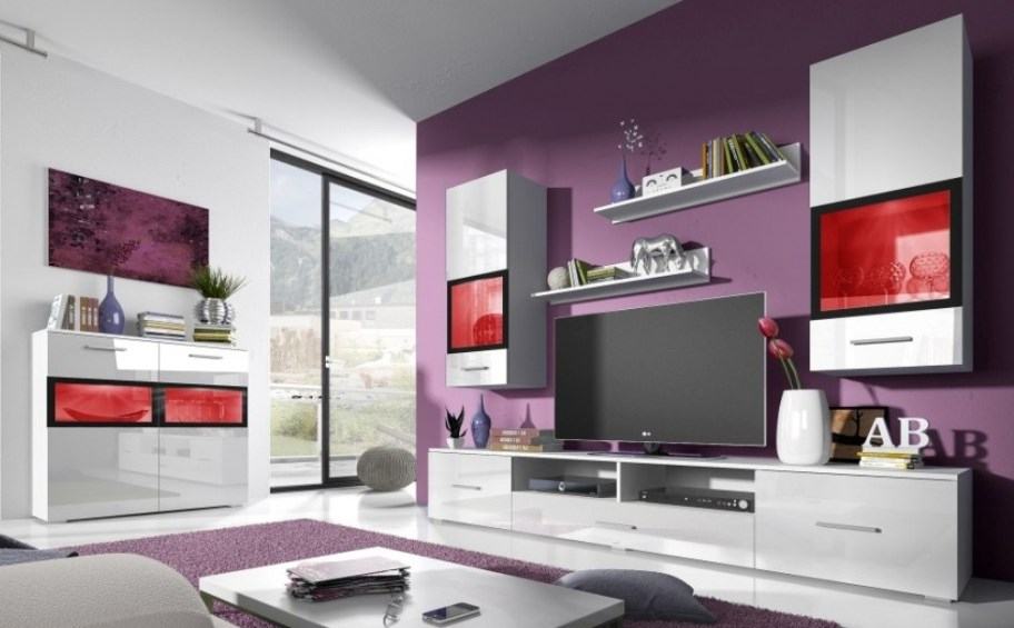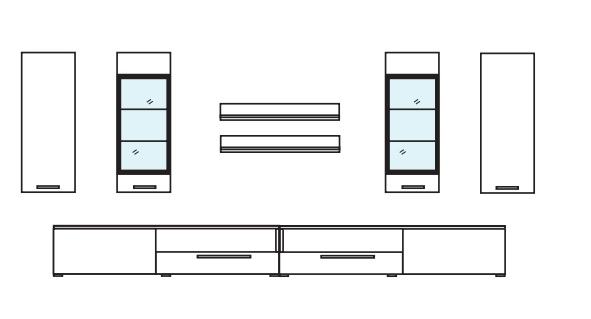 Veliki set: regal za TV, 2x polica, 2x stenska omara s steklom, 2x stenska omara