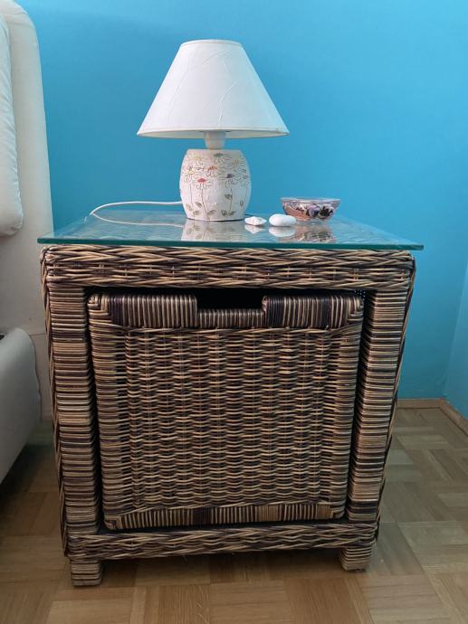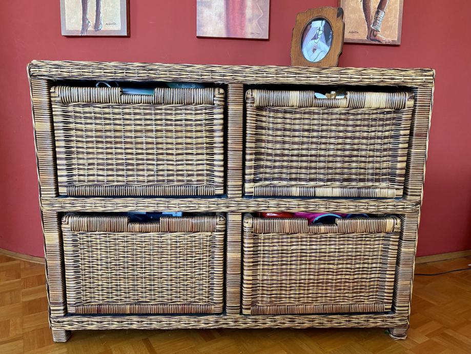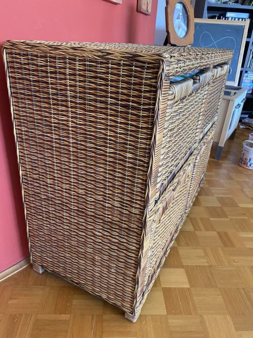 Odlično ohranjena omara z štirimi predalniki. Eksotični izgled (zaradi materiala-les) vam bo popestril spalni ali dnevni prostor in popeljal v tople kraje... zraven še tudi nočna omarica (na povrhu steklo) z enim izvlečnim predalom. Kvaliteten, trši material.
