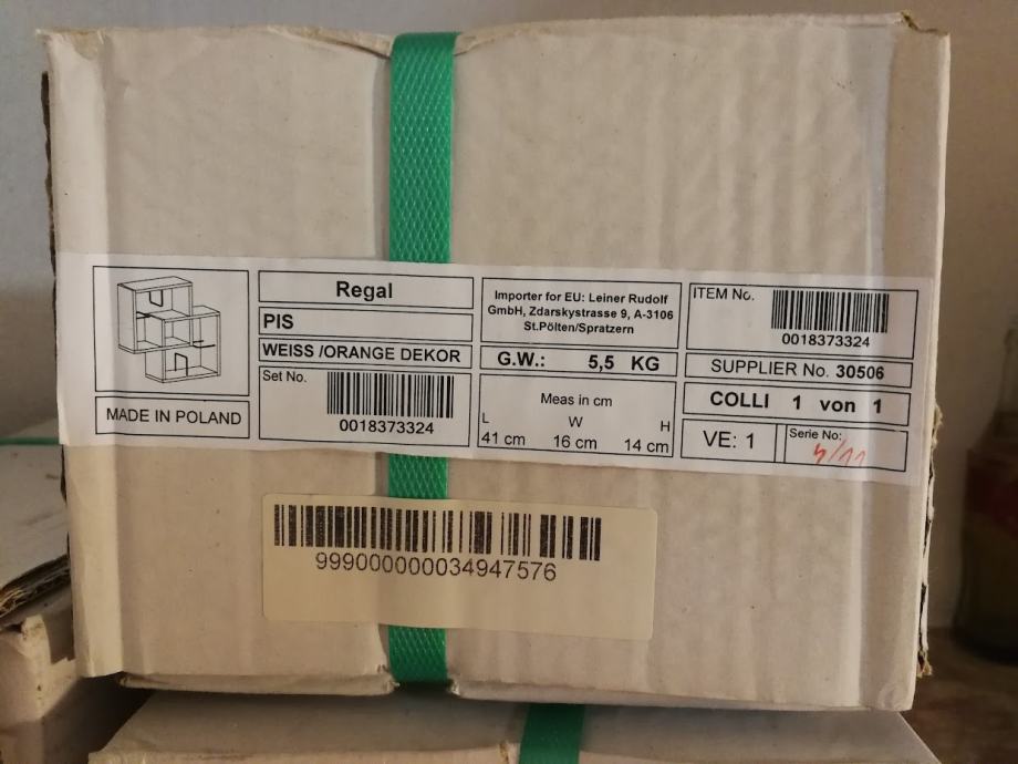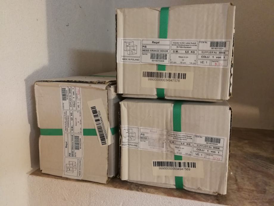 Regali kot na sliki, novi še ne sestavljeni v oranžni in zeleni barvi.