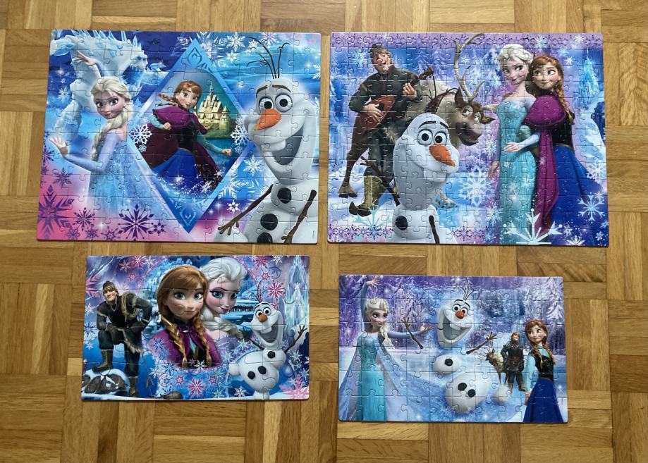 Prodam 4 puzzle Frozen. Primerne za otroke starejše od treh let. Vse puzzle imajo vse kose.