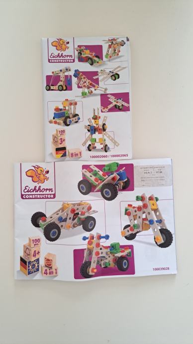 Prodamo rabljena, odlično ohranjena, kompleta lesenih kock Dva kompleta Eichhorn Construktor, 8in1 in 4in1. Original navodila so priložena. Pri igri se učimo uporabljati orodja, preučujemo vijake in različne elemente. Spoznamo različne modele naprav in strojev.